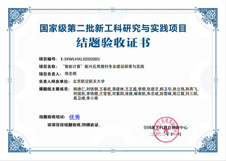 国家级第二批新工科研究与实践项目:“智能计算”新兴应用理科专业建设探与实践(项目编号:E-SXWLHXLX20202601),由betway西汉姆联平台牵头,联合南京航空航天大学理公司、电子科技大学betway西汉姆联平台、西安电子科技大学数学与统计公司、太原理工大学数学公司、高等教育出版社、杭州电子科技大学理公司和桂林电子科技大学数学与计算机科学公司共同实施。课题研究总体时间为三年(从2020年2月-2022年11月),现通过结题验收,验收结论为优秀。