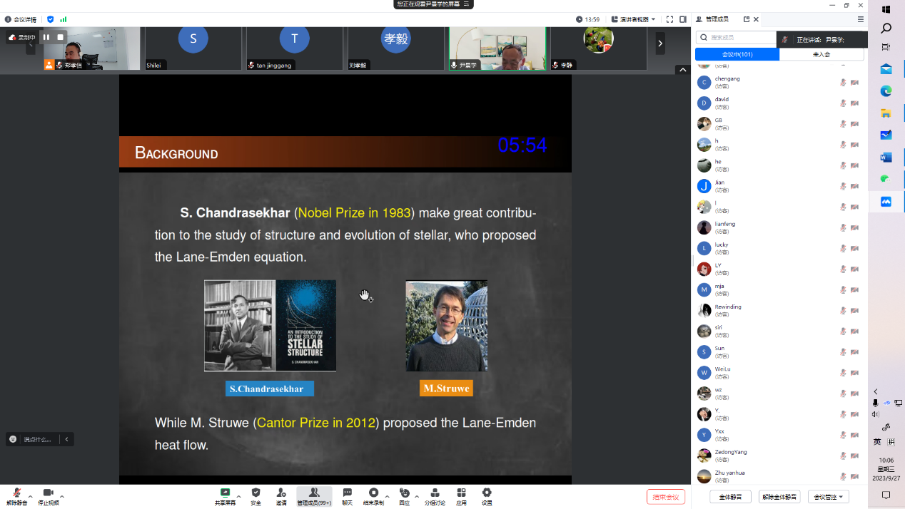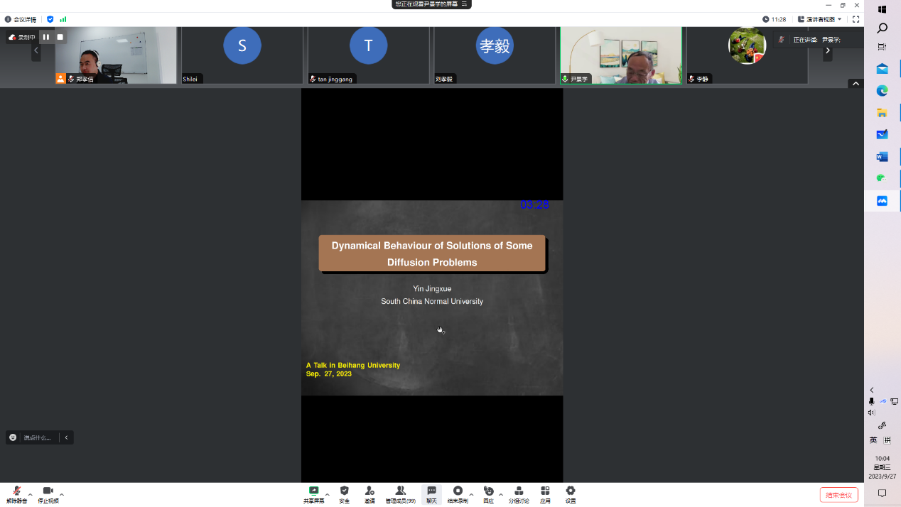报告中,尹教授以线性问题为切入点,回顾了线性耗散和非线性耗散模型提出的历史背景及其在天文学和天体物理学领域的应用。接着,围绕非线性耗散模型中的数学问题,从周期解到生命跨度的角度,尹教授系统介绍了该研究领域的研究现状及发展趋势。此次报告内容丰富,启发性强,拓宽了师生的学术视野,令参会师生受益匪浅。