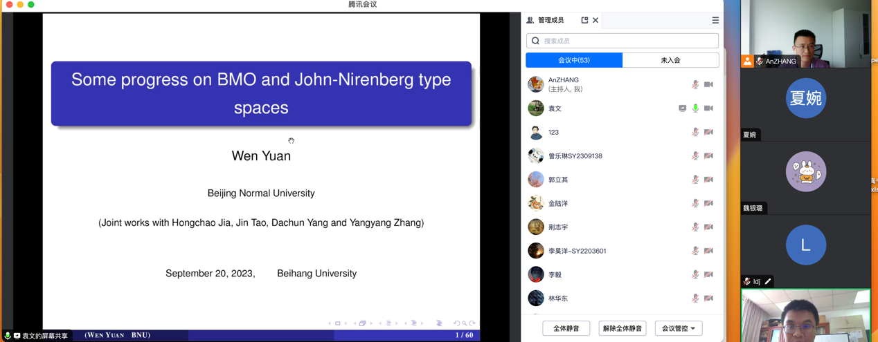 2023年09月20日,北京师范大学袁文教授,应邀为betway西汉姆联平台师生做了题为 “Some progress on BMO and John- Nirenberg type spaces”的学术报告。报告由张安老师主持。
