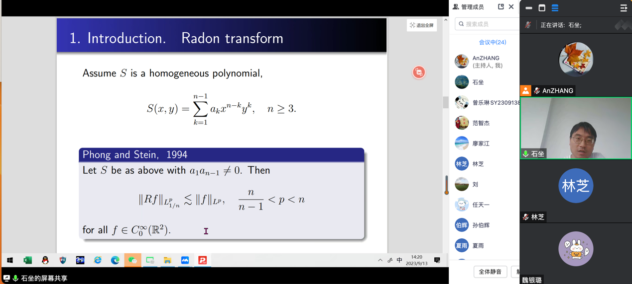 本次报告,石坐老师介绍了一类多项式相位的Radon变换的端点正则性问题,在一定的条件下,证明了端点正则性是不成立的,这推广了Christ 在上世纪80年代的工作。范老师介绍了Schatten空间和Riesz变换交换子的最新进展。绕过傅里叶分析和欧式空间的二进结构,证明了非交换Riesz变换交换子的Schatten范数可以通过象征的Besov范数来刻画。