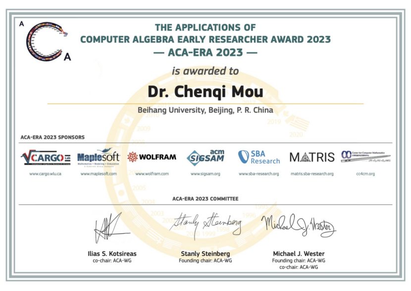 第28届国际计算机代数应用大会于2023年7月17-21日在波兰华沙举行,期间颁发了“2023年计算机代数应用青年学者奖”(The Applications of Computer Algebra Early Researcher Award 2023),公司牟晨琪副教授荣获该奖。