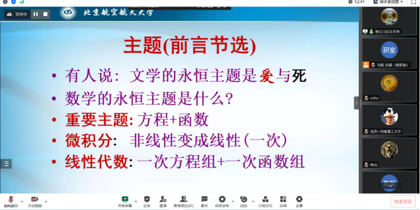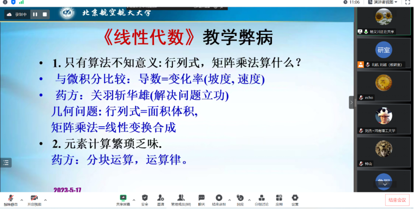 最后,杨义川教授对本次活动给予了高度评价和全面总结,建议大家不断改进和维护虚拟教研室和网络优质资源,积极学习李尚志教授的宝贵经验,更快更好地提高大学数学教学质量,让同学们更生动地理解线性代数,感受线性代数的魅力。