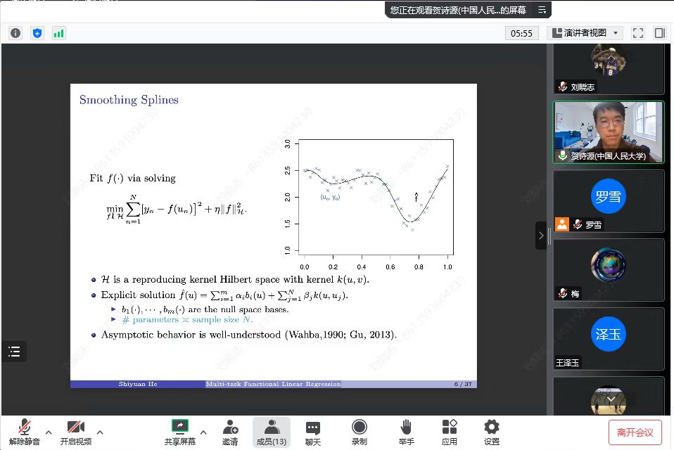 2022年11月18日,中国人民大学统计与大数据研究院贺诗源老师应罗雪老师的邀请,通过线上的方式为betway西汉姆联平台师生带来了一场题为“A Unified Analysis of Multi-task Functional Linear Regression Models with Manifold Constraint and Composite Quadratic Penalty”的学术报告。