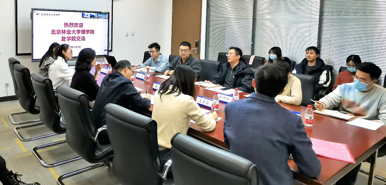 田阳对北航数学公司在各领域取得的突出成绩表示了充分肯定和高度评价。他从思政建设、人才培养、团队建设、科研创新等方面介绍了北京林业大学理公司的基本情况。田阳指出,北京林业大学理公司近年来积极探索如何将党建优势转变为发展优势,将思政建设融入人才培养和团队建设全过程,逐渐形成了“1+4+N”三全育人体系,他表示,希望双方就探索数学团队建设加强交流与合作,在党建、团队建设、人才培养等方面积极探索合作模式。