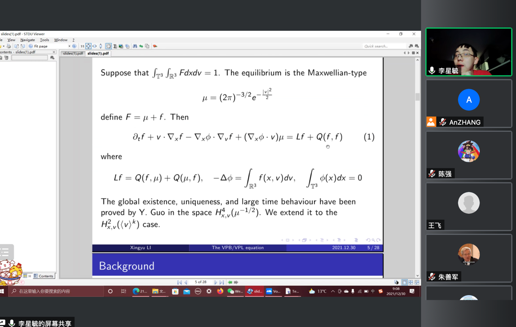 2021年12月30日下午,巴黎第九大学李星毓博士,应邀为betway西汉姆联平台师生做了题为 “The Vlasov-Poisson-Boltzmann/Landau equation with polynomial perturbation near Maxwellian”的学术报告,报告由任天一和张安老师主持。