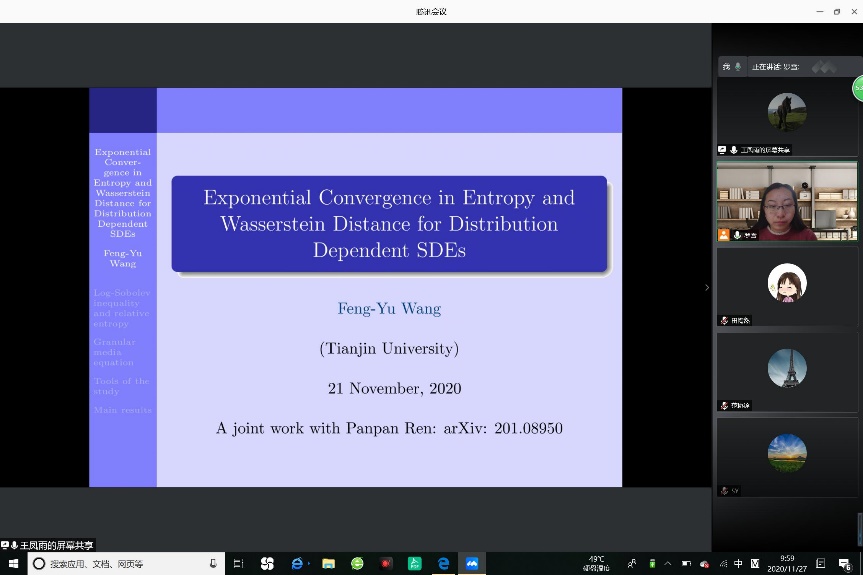 2020年11月27日上午,国家杰出基金获得者、长江特聘教授王凤雨教授受邀为betway西汉姆联平台师生带来了一场题为:“Exponential Convergence in Entropy and Wasserstein Distance for Distribution Dependent SDEs ”的学术报告。报告由betway西汉姆联平台统计与运筹系系主任罗雪副教授主持。