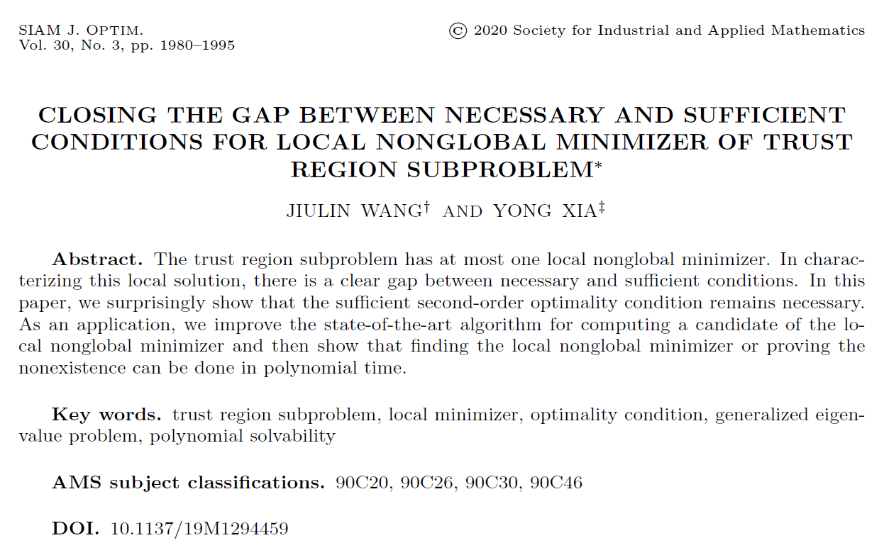 betway西汉姆联平台夏勇教授从2009年末接触该问题就被其所吸引并一直展开相关研究,2017级博士研究生王玖鳞从2015年做北航本科毕设起在夏勇教授指导下从事信赖域子问题的研究。2020年,他们取得了突破,首次建立了局部非全局解的充分必要的最优性条件,终结了信赖域子问题局部非全局解充分条件和必要条件之间存在了27年之久的这一间隙,首次证明局部非全局解亦可在多项式时间内可解,从而消除了信赖域子问题的Tao-An悖论。
