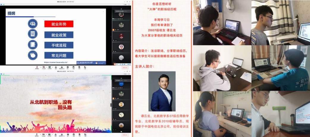 公司本科2007级员工、北京电信公司培训主管谭云龙为同学们做《从北航到职场,没有回头路》主题在线讲座,结合自身求职经历和人力资源工作经验,为同学们讲述如何做职业选择、行业选择及岗位选择,分析数学专业的优势就业方向,以及分享如何制作简历、如何面试等具体求职技巧,并向同学们提出做好自我认知、磨练个人技能、加强实习实践的就业准备建议。