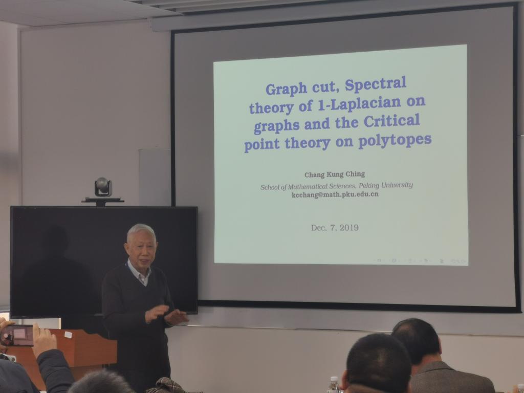中国科公司院士,世界科公司士,张恭庆教授做了精彩报告,介绍了关于非光滑临界点理论的最近工作,并将其运用于图分割问题中,为这一问题的计算中许多基于实践的方法提供了严格的数学依据,尤其是给出了Cheeger常数与Mountain Pass点之间的漂亮关系。