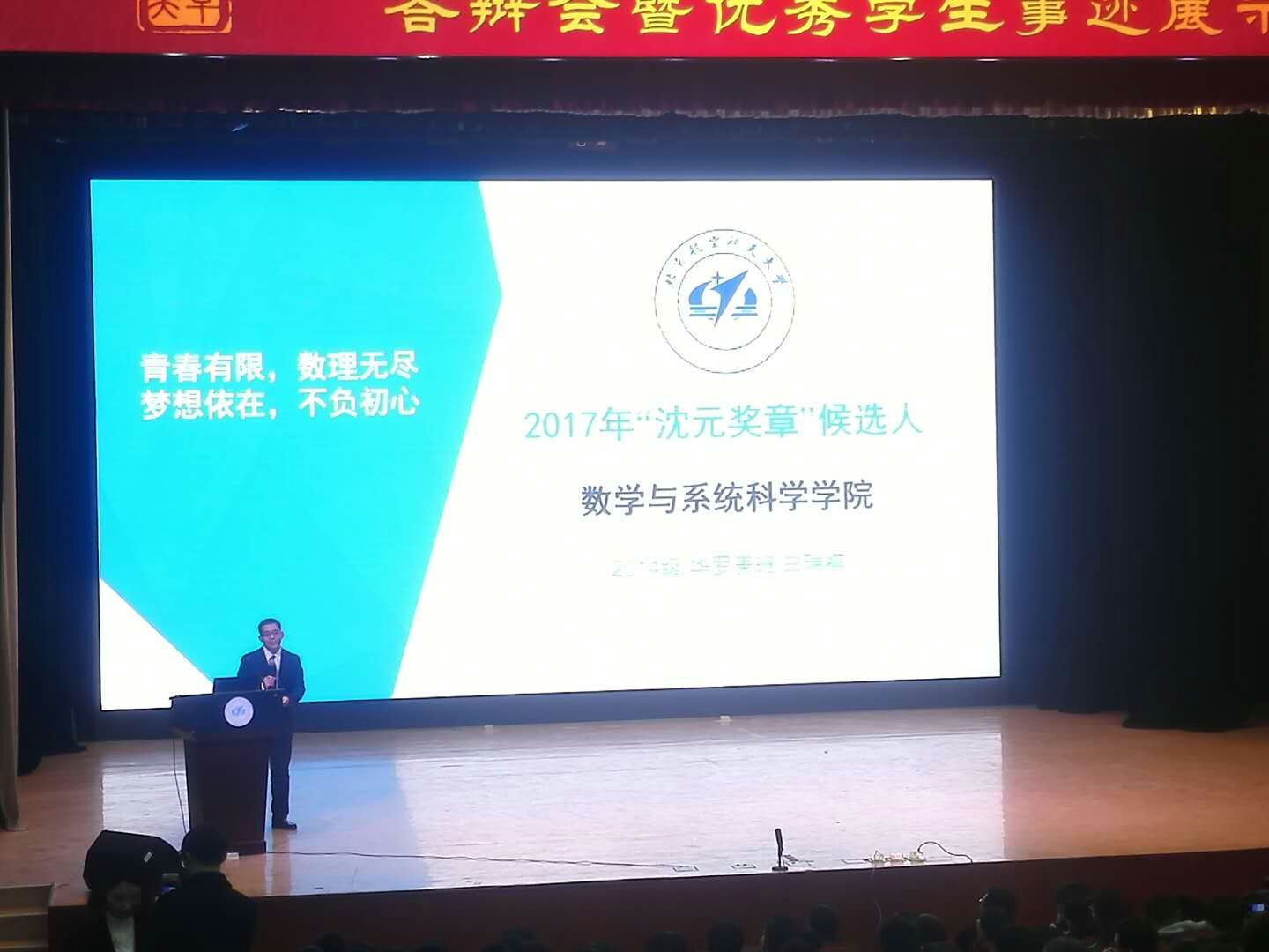 经过公司的前期评审,公司2014级本科生白瑞祺同学脱颖而出,成功作为候选人参加最终答辩。答辩会上,他分别从学习成绩、高水平竞赛、学术成果、获奖情况和社会工作五个方面全方位、多角度地展示了自己在逐梦道路上的收获与成长。“我就好比一个局部环,数学是我唯一极大理想!”,白瑞祺同学用自己不忘初心、勇敢追逐的数学梦想将现场气氛推向高潮,观众席掌声不断。经过与25位优秀北航学子的激烈比拼,白瑞祺同学最终荣获北航本科生最高荣誉“沈元奖章”。