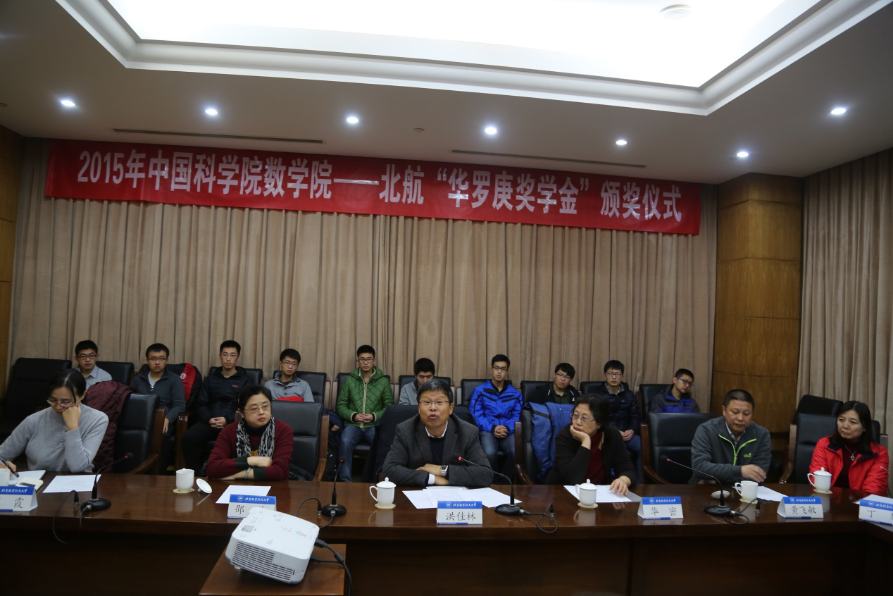 11月20日,2015年中国科公司数学与系统科学研究院——betway西汉姆联平台“华罗庚奖学金”颁奖仪式在新主楼第五会议室举行。betway西汉姆联平台纪委书记、工会主席纪素菊教授、中国科公司数学与系统科学研究院副经理洪家林研究员,华罗庚女儿华密女士出席了颁奖仪式并致辞。颁奖仪式由北航数学公司经理郑志勇教授主持。