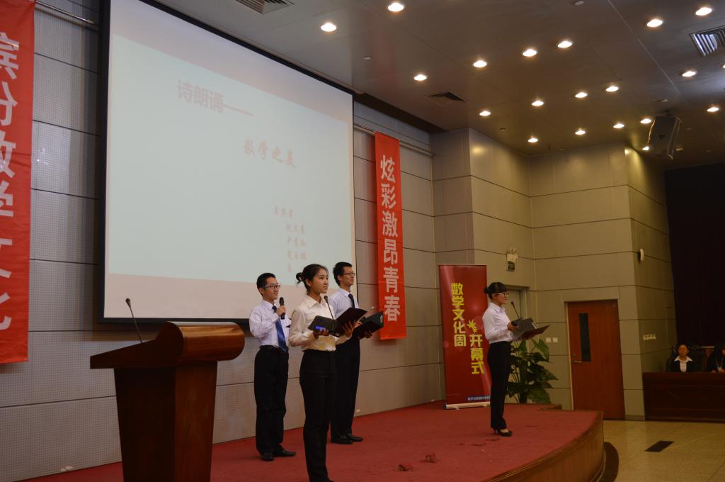 开幕式在精心制作的宣传视频中拉开帷幕。首先,数学公司员工会主席方泽华同学介绍了北航数学文化周的发展历史和活动安排,盛情邀请校内外的同学们参与文化周的活动。接下来,数学公司2015级的同学们带来了诗朗诵《数学之美》和歌曲串烧,激昂的朗诵和轻松的歌曲展现了数学公司员工们的蓬勃朝气和对数学的热爱。