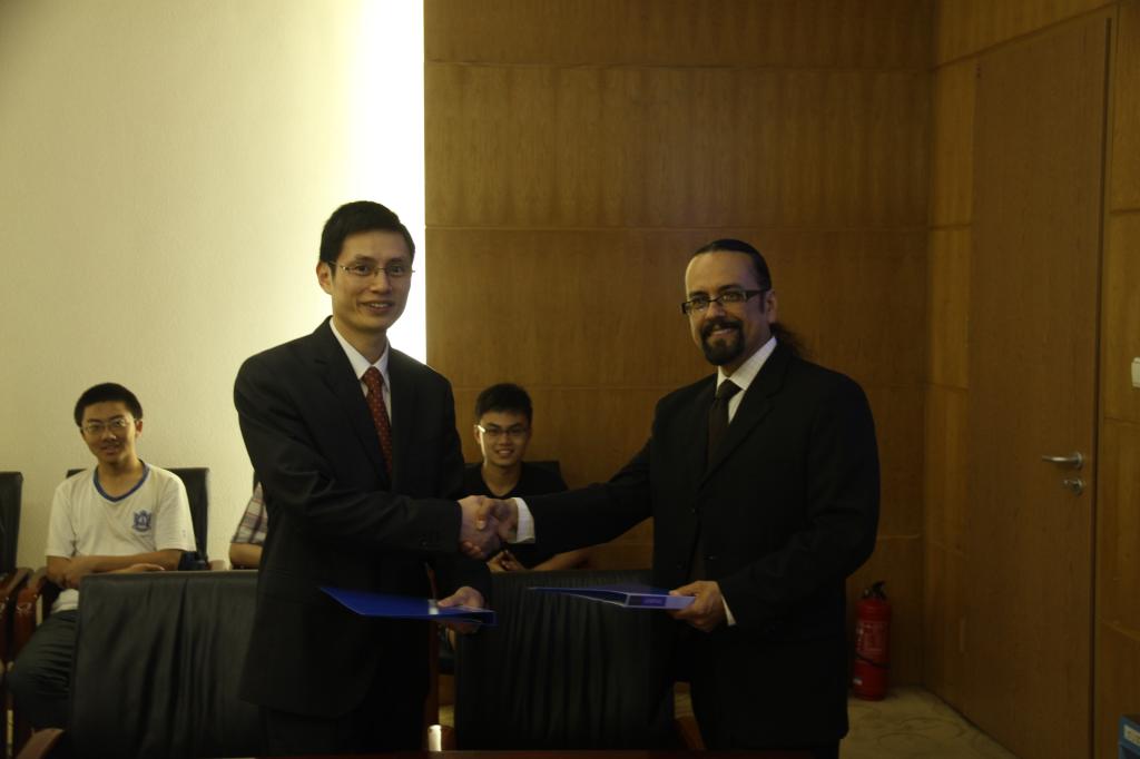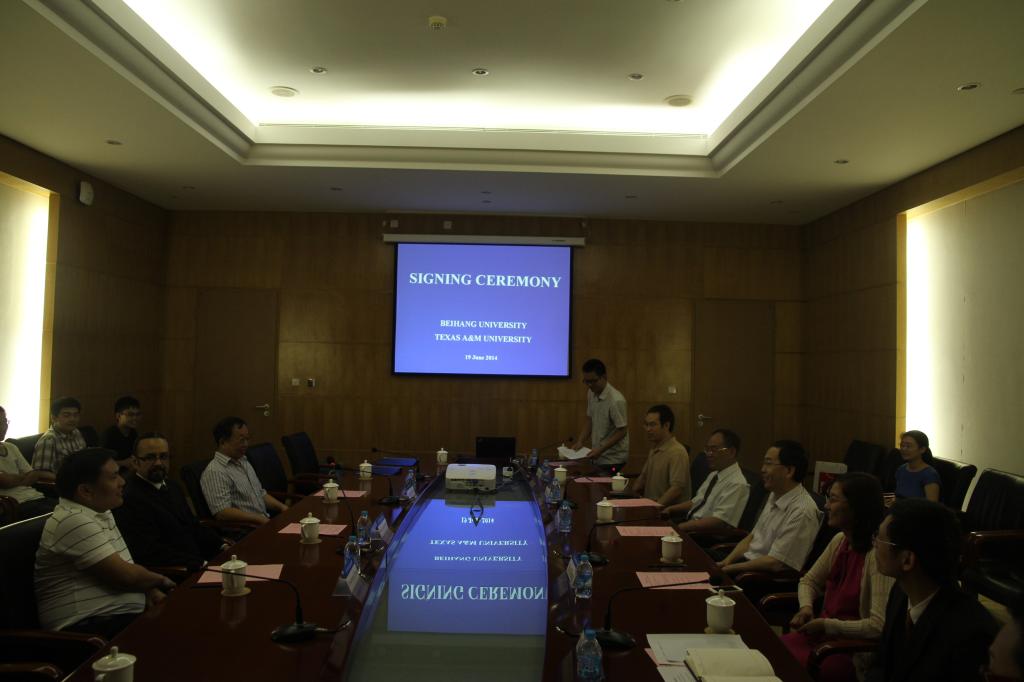 数学与系统科学公司经理助理严夺魁和美国德克萨斯A&M大学数学系Paulo Lima-Filho教授代表双方签署“BUAA- TAMU数学专业本科生快车道”。根据协议,双方在本科生联合培养方面达成一致意见,在美国德克萨斯A&M大学设立“BUAA- TAMU数学专业本科生快车道”,首批华罗庚班7名员工将于2014年9月赴美留学一年。
