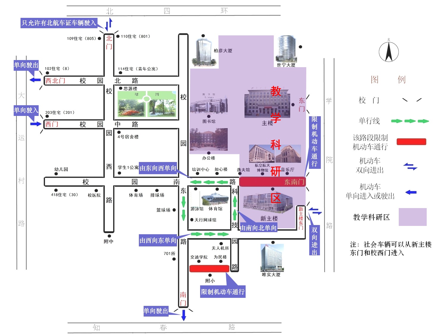 一、将办公楼和逸夫科学馆以东区域、校园南路东段(新主楼北侧)、新主楼纳入公司教学科研区的整体管理,教学科研区内限制机动车通行(救护车、消防车、洒水车、绿化专用车等各类型特殊车辆除外)。