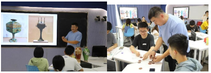 在李大冬老师的指导下,师生们热情高涨地投入到点蓝的实际操作中。大家用小铲或吸管,将珐琅釉料依次填入焊好的铜丝纹饰框架中,体验这门古老技艺的精妙之处。尽管制作过程繁琐,但师生们表现出了极大的耐心和创意,最终完成了一件件独具匠心的景泰蓝作品。