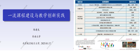 在报告中,陈教授概述了国家精品课程、国家精品资源共享课、国家精品视频公开课、国家精品在线开放课程以及国家级一流课程的发展历程。介绍了全国高校青年教师教学竞赛以及全国高校教师教学创新大赛的基本情况。基于东南大学线性代数一流课程建设的做法,分享了东南大学在教学创新方面的基本情况,特别是教学资源建设,以及 “三融入,三统一” 教法的具体实施方案。最后,陈教授不仅给出了参加教学创新大赛的实用建议,还与北航数院教师就课程建设进行了深入交流。